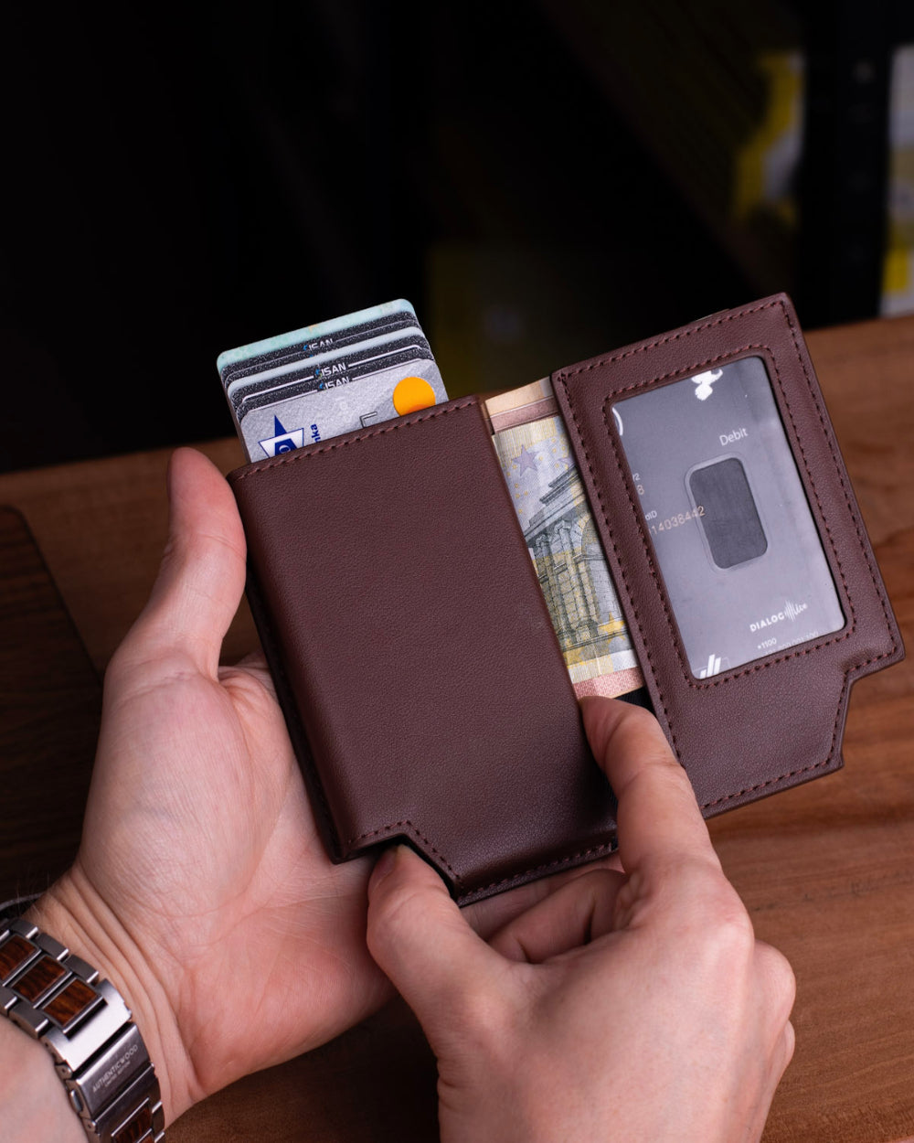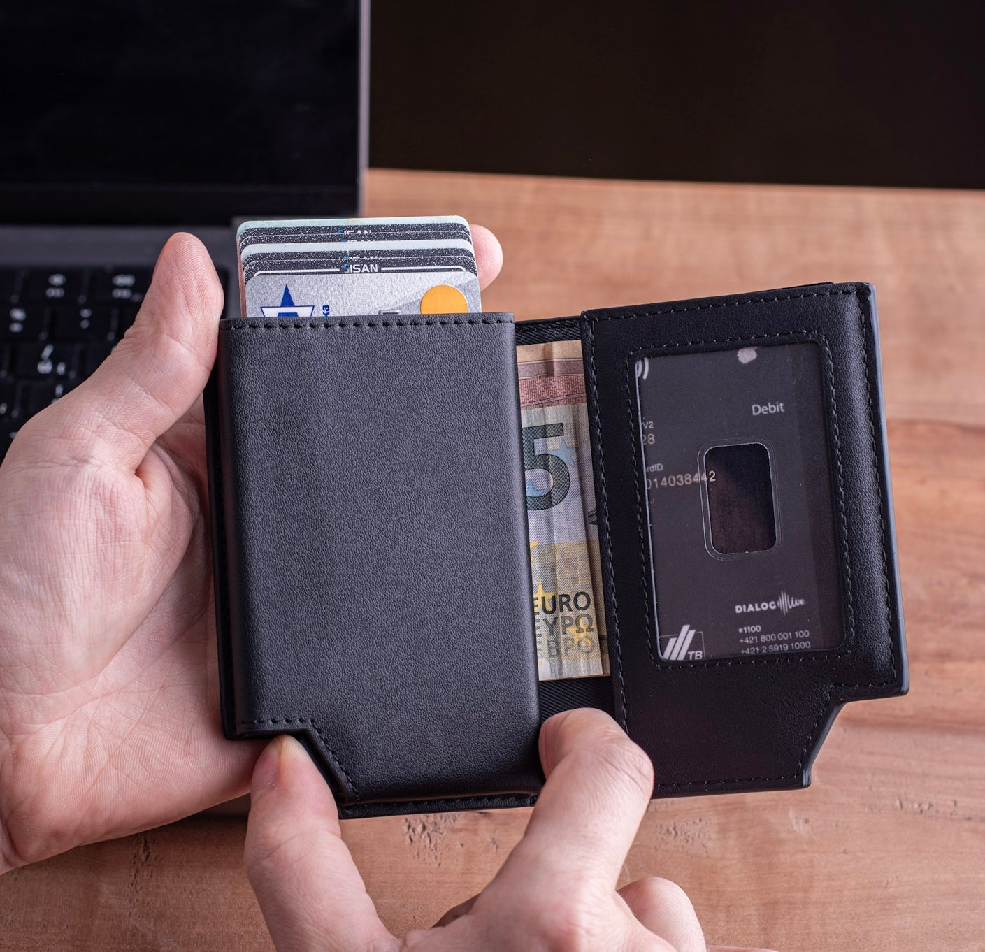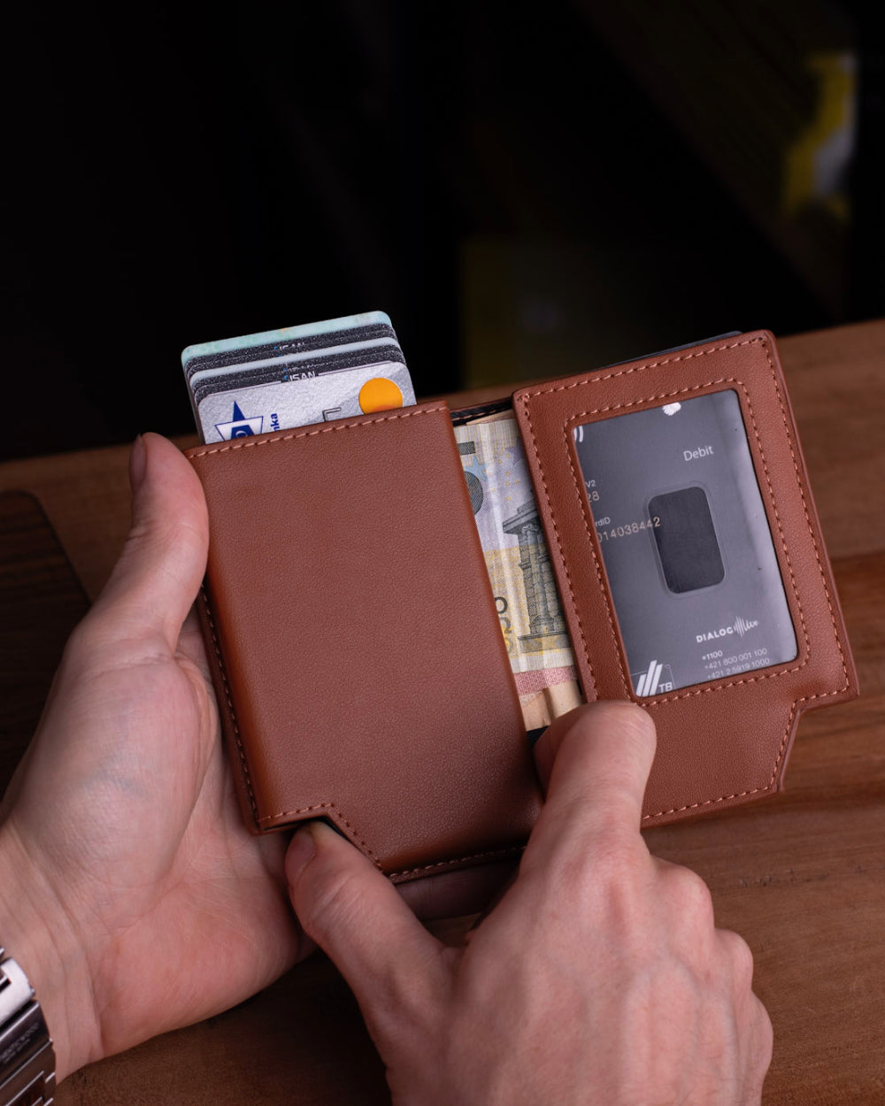 Κατασκευασμένο από premium vegan δέρμα, συνδυάζει ευρύχωρο σχεδιασμό, ομαλό pop-up σύστημα καρτών και μινιμαλιστική κομψότητα σε ένα εκλεπτυσμένο design.